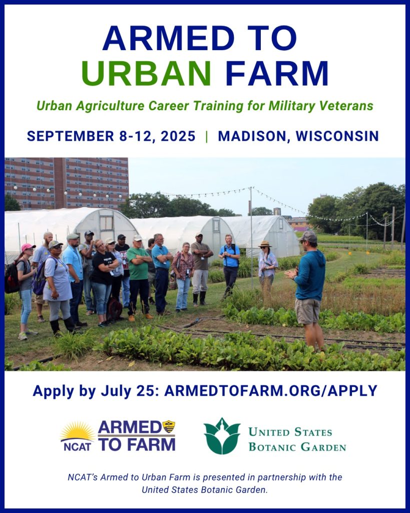 Our Armed to Farm program has helped more than 1,000 veterans across the country over the past decade. This fall, NCAT is bringing the training to Madison from September 8–12, with a focus on urban and small-scale agriculture. The program combines classroom instruction with hands-on farm visits and is open to veterans and their spouses or farm partners.